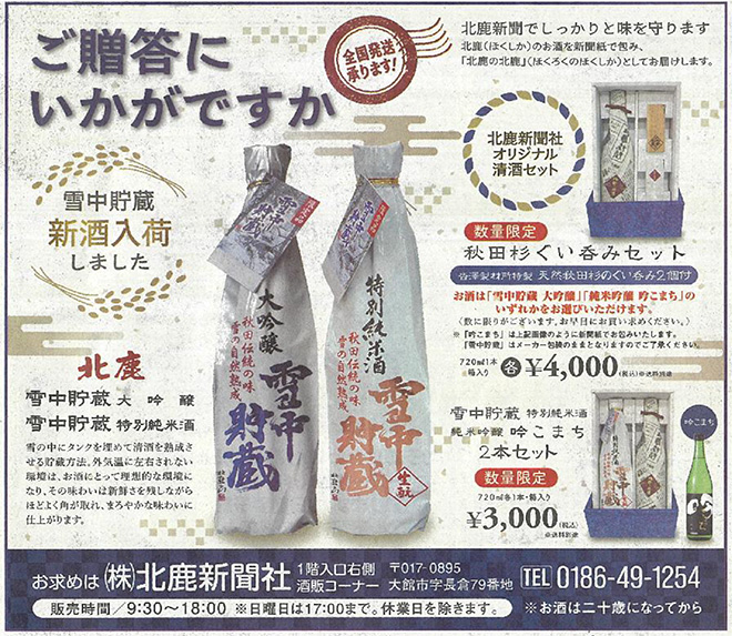 地元の北鹿新聞社が雪中貯蔵「大吟醸・特別純米酒」の発売に合わせ、第5弾として一面トップ下に独自広告を掲載しております。