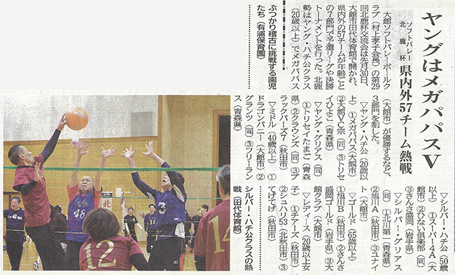 北鹿の冠で大会が開催され29年目にはいりました。年齢ごとに7部門に分かれ熱戦が繰り広げられました。 当日は県外からの参加があり大変な盛り上がりでした。 大会を通じ今まで以上にソフトバレーボールが広く知れ渡ればと思います。 優勝賞品や参加賞に北鹿のお酒を贈呈いたしました!
