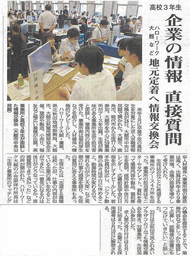秋田県で就職を希望している生徒さんへ、会社の概要や仕事内容、求人票に基づき待遇や福利厚生についてもお話いたしました。 北鹿では令和8年卒の高校生の方を対象に会社見学を実施しております。 今回の交換会にお越しにならなかった方も大丈夫ですので連絡お待ちしております。