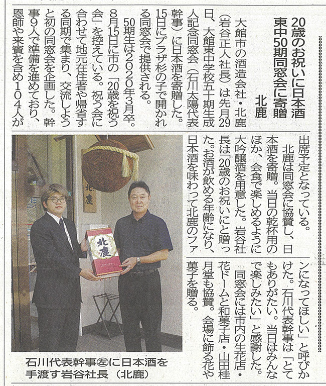 地元でお盆に開催します「20歳を祝う会」へ日本酒を寄贈しました!同総会開催の際には是非北鹿のお酒を飲んでいただき楽しんでいただければと思います。