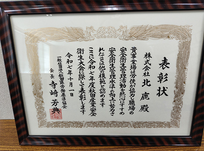 今回の受賞は安全衛生管理活動を熱心に行っている企業や個人に贈られるものです。 賞状を写真にて掲載いたします。今後ともグループで行っている3S活動を軸に、更なる安心安全で働きやすい職場を目指します!