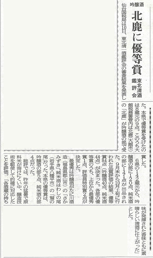 東北清酒鑑評会の審査結果が発表されました。北鹿は吟醸酒の部で3年続けての優等賞をいただきました。 社員一同、今後も品質を第一にお酒造りに精進いたします。