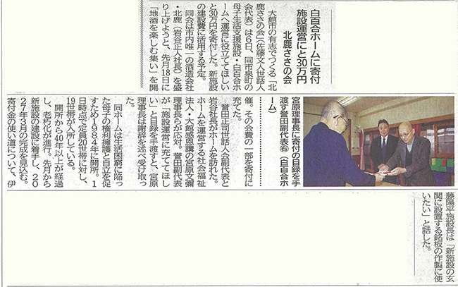 「第18回 北鹿ささの会~地酒を楽しむ集い~」を10月18日に開催し、会費の一部を今年は生活支援施設へ寄付しております。その内容が地元紙に掲載されました。