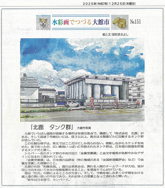 地元紙北鹿新聞にて、弊社の外からの様子が水彩画にて描かれました。とてもリアルに描かれております。北鹿のことも書いております!