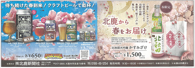 今回掲載された商品は、弊社の春の限定酒「大吟醸かすみ酒」となります。薄にごりの美味しいお酒です。かすみ酒以外のお酒も取り揃えています。お問い合わせは北鹿新聞社様まで!