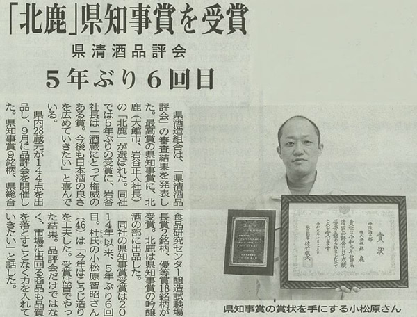 県清酒品評会で5年ぶり6回目の最高賞「県知事賞」受賞が地元北鹿新聞で大きく取り上げられました。