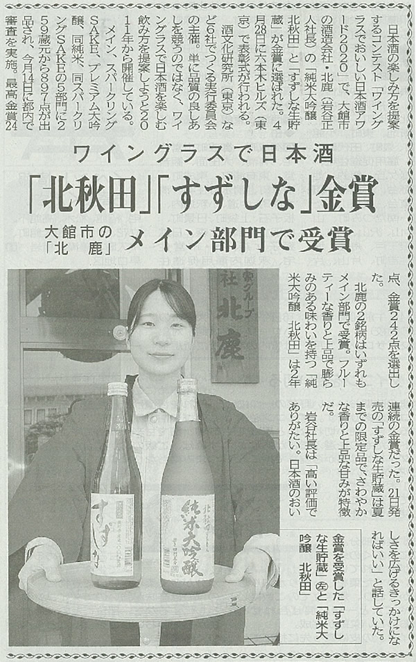 第10回ワイングラスでおいしい日本酒アワード2020において、本年も弊社の「純米大吟醸 北秋田」と「すずしな生貯蔵」がメイン部門で金賞を受賞致しました。