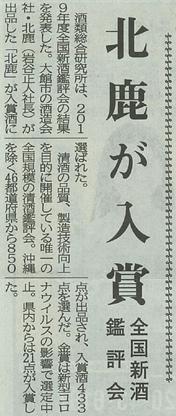 優れていると評価した入賞酒に「北鹿」が今年も選ばれました。 県総合食品研究センター醸造試験場によると本県からの入賞酒は21点選ばれました。残念ながら金賞酒の選定は新型コロナウイルス感染拡大に伴う移動自粛より中止となりました。進藤昌場長は「酒造りには厳しい条件だったが本県からの入賞した酒が多く、杜氏のレベルの高さが証明された」と語っております。