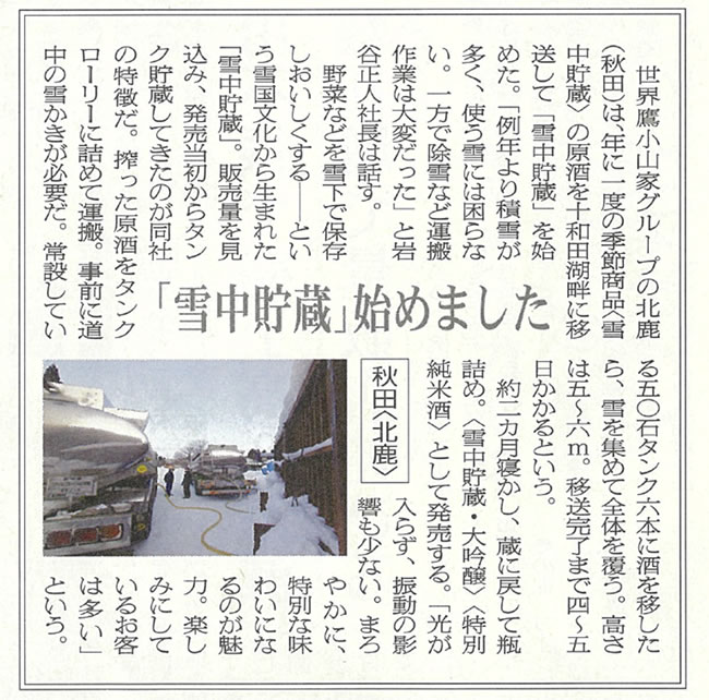 雪中貯蔵についての記事が2月15日の業界全国紙に掲載されました。