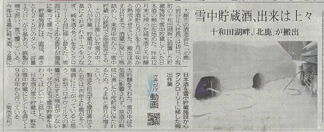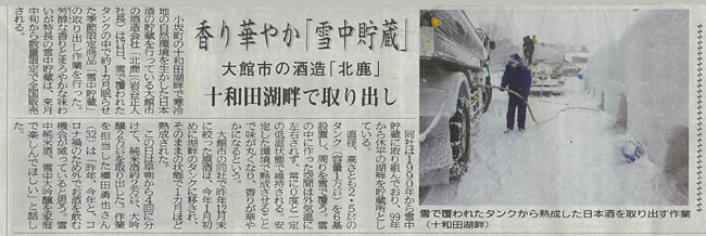 雪と風の中で行われた「雪中貯蔵」日本酒の搬出作業が秋田魁新報と北鹿新聞の記事に、またテレビ各局のニュースとしても取り上げられました。