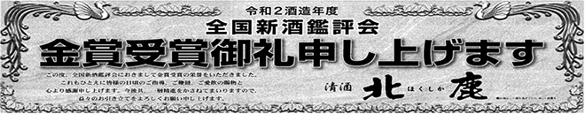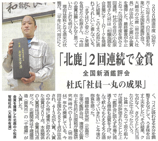 全国新酒鑑評会において弊社「北鹿」が2回連続で最高の栄誉[金賞受賞]した事を地元北鹿新聞に記事として取り上げられました。
