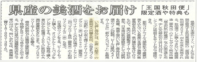 秋田県酒類卸の「美酒王国秋田便2021」を本年も実施し、県内の酒蔵が参加しております。是非ご応募・ご賞味頂ければと思います。お買上げの方にもれなくオリジナルトートバッグをプレゼント致します。