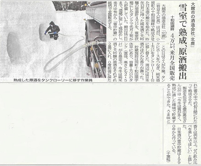 雪中貯蔵の十和田湖畔で熟成された原酒の搬出が始まりました。2月15日付の魁新聞に記事として掲載されました。全国への出荷(発売日)は3月11日より、ぜひ今年の雪中貯蔵もご賞味ください。