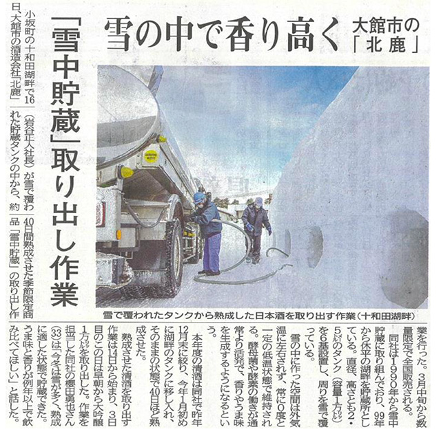"雪の中で香り高く"と「雪中貯蔵」の取り出し作業が地元の北鹿新聞に記事として掲載されました。また、県内のテレビ局でもニュースとして取り上げられております。