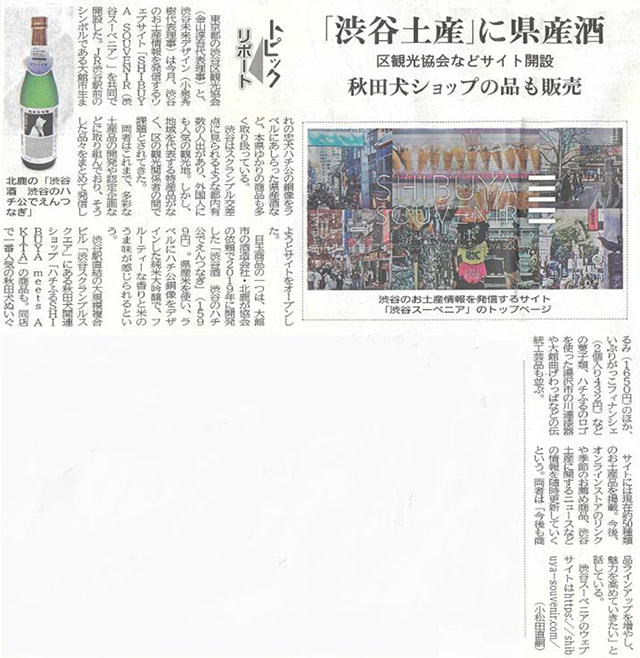 渋谷のお土産品として弊社のお酒「渋谷酒 渋谷のハチ公でえんつなぎ」について秋田さきがけ新聞〈首都圏発〉の記事に取り上げられました。