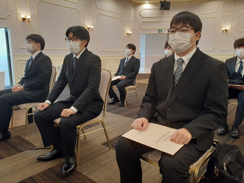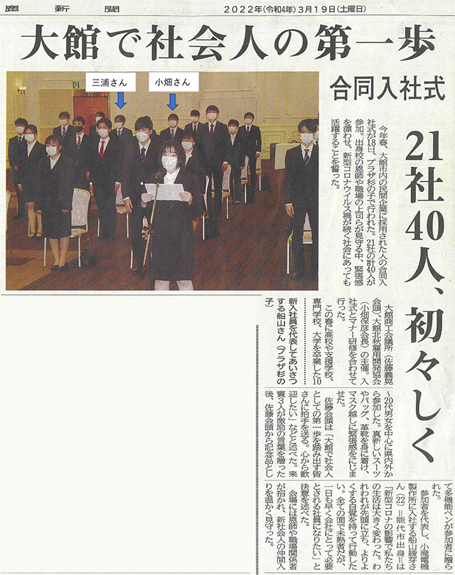 本来であれば4月1日グループ全体でのさいたま市での入社式に出席予定でしたが、本年はコロナ禍の状況で初めて地元(大館市)での合同入社式に2名出席させていただきました。