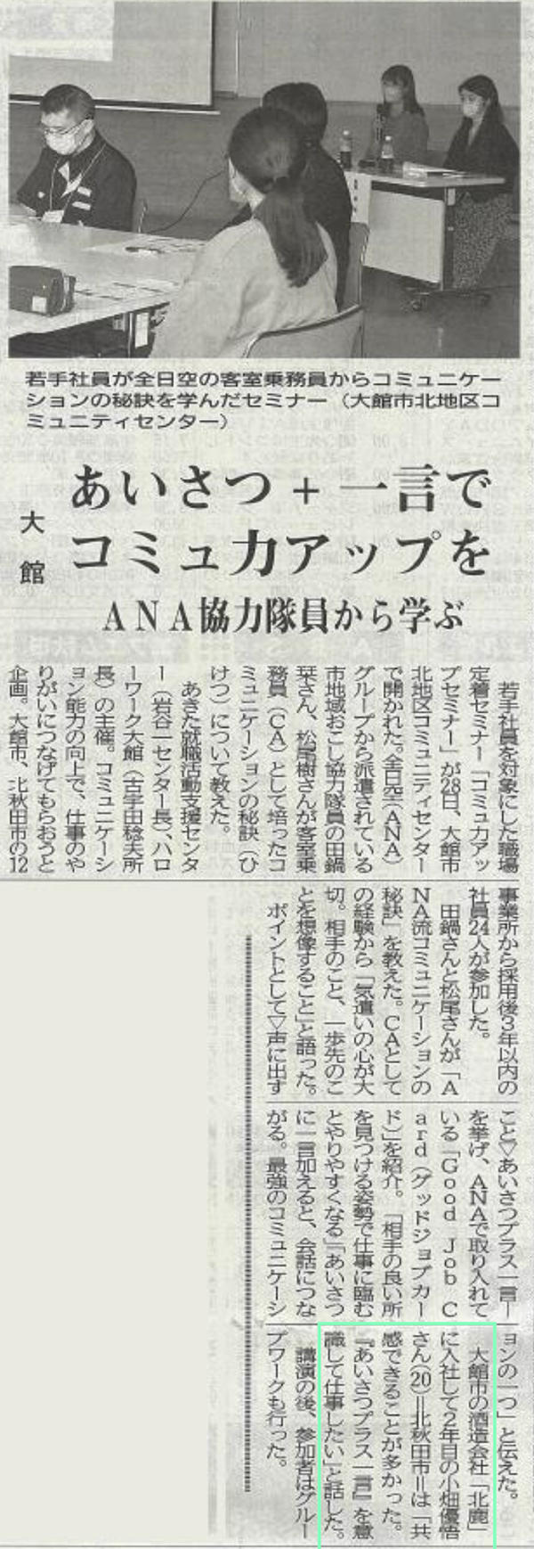 若手社員が全日空の客室乗務員からコミュニケーションの秘訣を学ぶセミナーが、9月28日開催され弊社から3名受講し、小畑優悟君が地元新聞の取材を受けた記事が掲載されました。