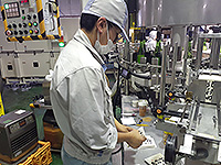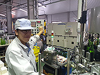 ラインで流れてくる瓶に対して機械で貼り付ける。失敗すると返品や回収になりかねない責任の重い工程だ。