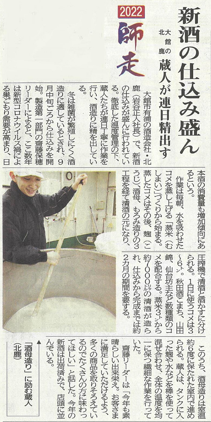 地元の北鹿新聞に、恒例の2022師走特集にて本年も弊社の酒造り風景が記事として取り上げられました。事故、ケガ等もなく仕込みの方も順調にすすんでおります。