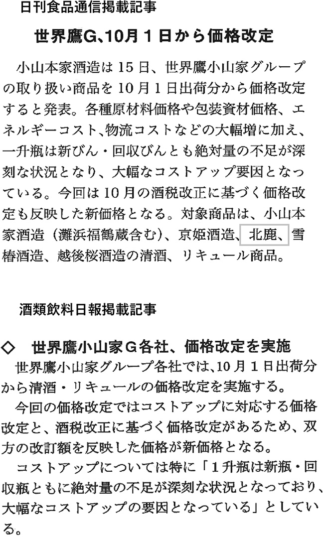 弊社の世界鷹小山家グループで、各種価格のコストが大幅増などにより10月1日から価格改定することが、業界紙の記事として取り上げられました。