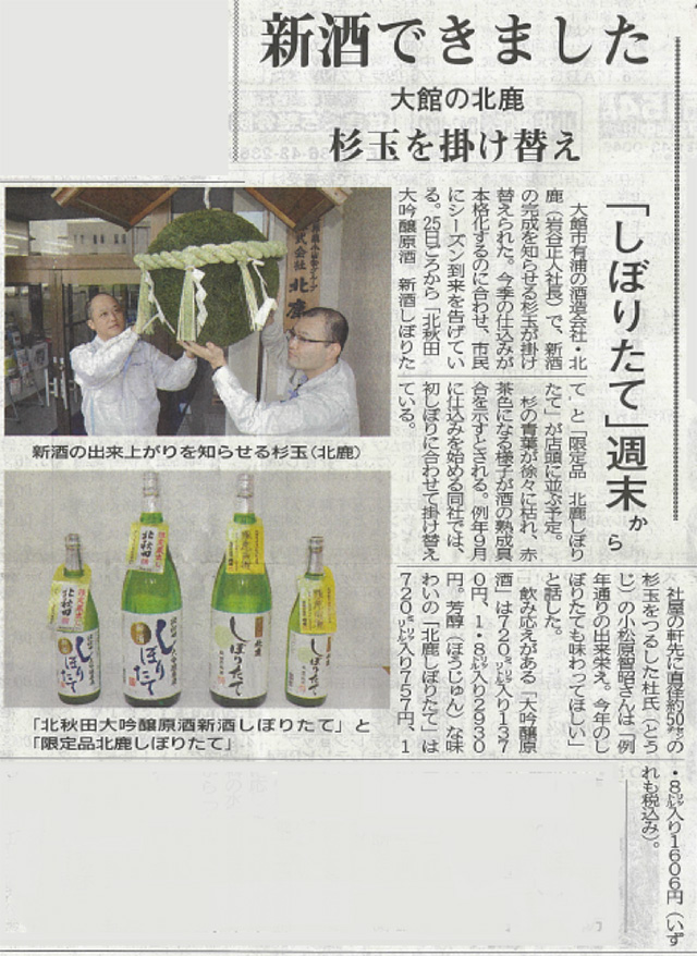 お待たせしました。〈新酒ができました!〉今週より「大吟醸原酒 新酒しぼりたて」と「北鹿しぼりたて」の限定品を発売いたします。地元新聞に、杉玉が掛け替えられたことが取り上げられました。