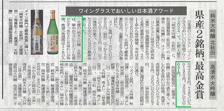 「ワイングラスおいしい日本酒アワード」は、"世代" "業態" "国"の境界を超えて日本酒を広げることを目的に2011年から酒類関係6社でつくる実行委員会が主催、そこで認められたメイン部門の最高金賞受賞酒【純米大吟醸 北秋田】を是非ご賞味ください。