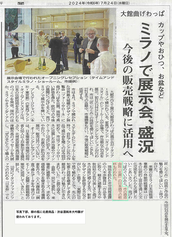 大館市の工芸品:曲げわっぱの展示会がイタリアのミラノで開かれました。展示会の様子と、会場で北鹿のお酒が振る舞われたことが地元新聞の記事で紹介されております。