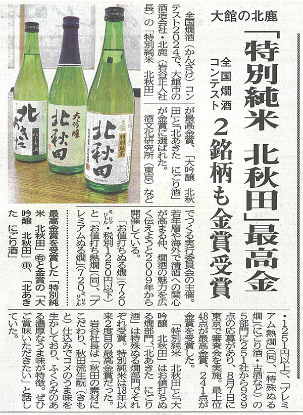 最高金賞に「特別純米北秋田」が選ばれました。特別純米北秋田は2度目の最高金賞となります。 金賞は「大吟醸北秋田」と「北あきたにごり酒」が受賞しております。 これから寒い時期となります。是非燗酒でもご賞味ください。