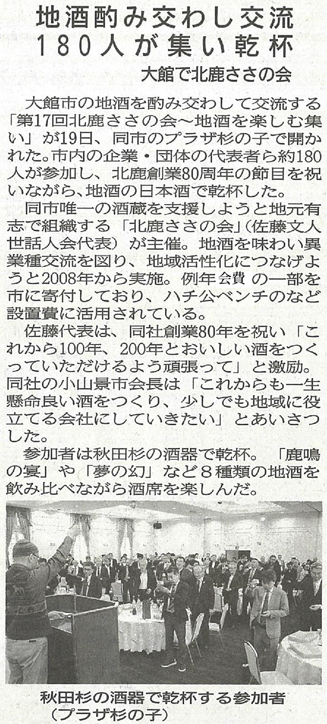 「第17回 北鹿ささの会~地酒を楽しむ集い~」を10月19日(土)開催しました。各界から182人の方々がご交流をされ、8種の地酒を味わい大盛況に終りました。ご参加いただきありがとうございました。今後とも宜しくお願いいたします。