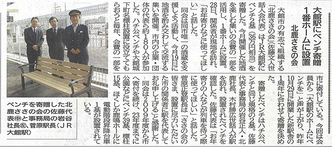 「第17回 北鹿ささの会〜地酒を楽しむ集い〜」を10月19日開催し、恒例の会費の一部を大館市に寄付しております。今年は、大館新駅舎の1周年に合わせホームに"ハチ公ベンチ"を寄贈したことが地元新聞に取り上げられました。
