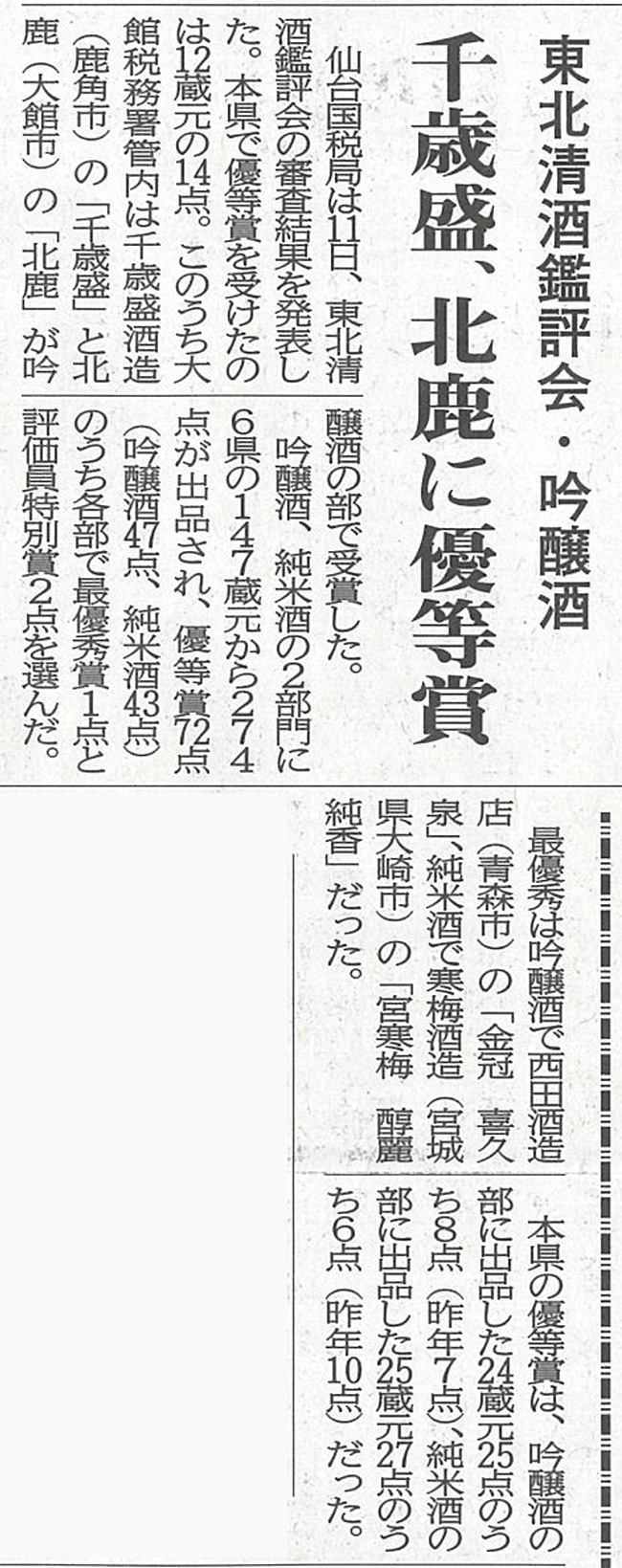 東北清酒鑑評会において吟醸酒の部で弊社(北鹿)が優等賞を受賞したことが、本日11月12日「北鹿新聞」に掲載されました。また「秋田さきがけ新聞」にも掲載となっております。
