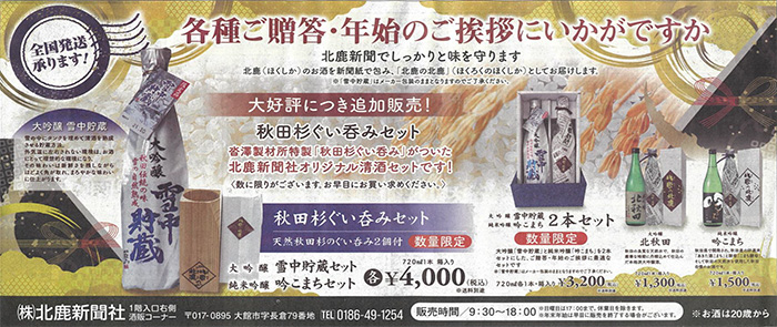 今回、新たに「雪中貯蔵大吟醸」が加わりました。北鹿新聞様の広告記事を掲載いたします。 ご希望の際は、画像の下部に記載の【㈱北鹿新聞社様】までお願いいたします!