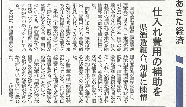 秋田県酒造協同組合が酒米や加工米の高騰が予想されているとして、仕入れ価格の補助などを求める陳情書を県知事に提出しております。 その様子の記事が5月8日の全県誌の秋田魁新報に掲載されました。