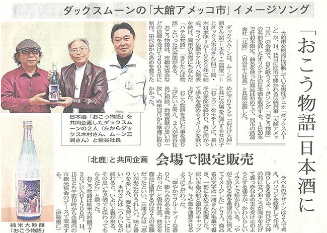 大館アメッコ市の限定品、男性デュオ「ダックスムーン」とのコラボ酒について、2月10日(火)秋田さきがけ新聞の記事にも取り上げられております。
